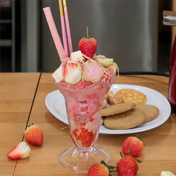 Các bạn có thể trang trí ly kem dâu chuối thành phẩm với 1 vài lát dâu tây tươi, thêm chút vụn bánh quy và socola lên trên bề mặt. Chắc chắn, các bạn đã có một món kem dâu chuối cực ngon giải nhiệt cho ngày hè nắng nóng.