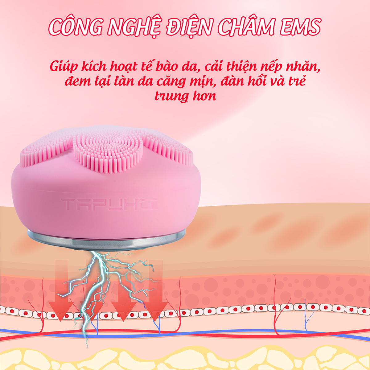 Máy rửa mặt Tapuho còn được trang bị công nghệ điện châm giúp kích thích các nhóm cơ ở phần hạ bì. Từ đó giúp làm săn chắc các cơ chảy xệ, kích thích cho da tái tạo và phục hồi, hỗ trợ điều trị nâng cơ mặt.