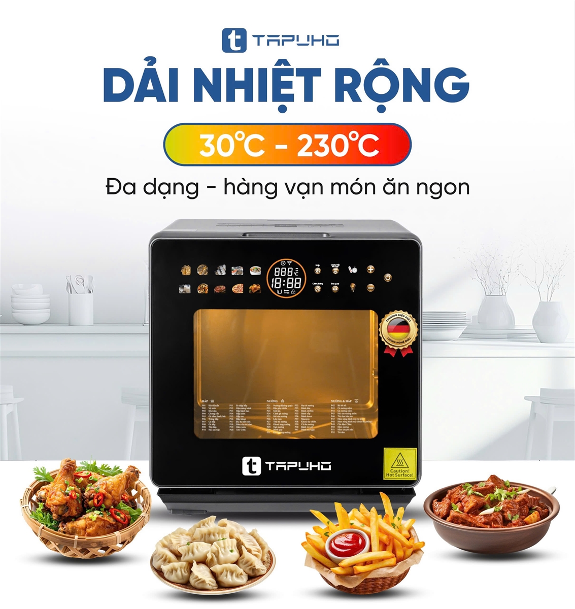 TAPUHO LUXURY STEAM FRYER TSF16 COLOR có dải nhiệt rộng 30℃ - 230℃ với chế độ chiên nướng (các dòng nồi chiên khác chủ yếu dải nhiệt từ 70℃-200℃), đồng thời có dải nhiệt 40℃ – 130℃ với chế độ hấp (với một số dòng dòng nồi chiên hơi nước, mức nhiệt hấp cố định là 100 độ và không điều chỉnh được nhiệt độ mong muốn).
