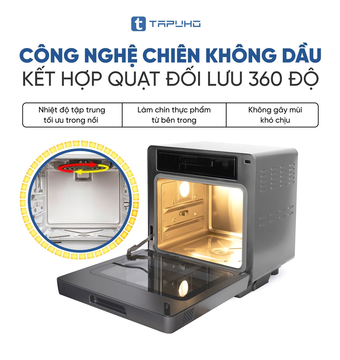 6. CÔNG NGHỆ CHIÊN KHÔNG DẦU KẾT HỢP QUẠT ĐỐI LƯU 360 ĐỘ – GIẢM 96% LƯỢNG CHẤT BÉO CÓ TRONG THỰC PHẨM