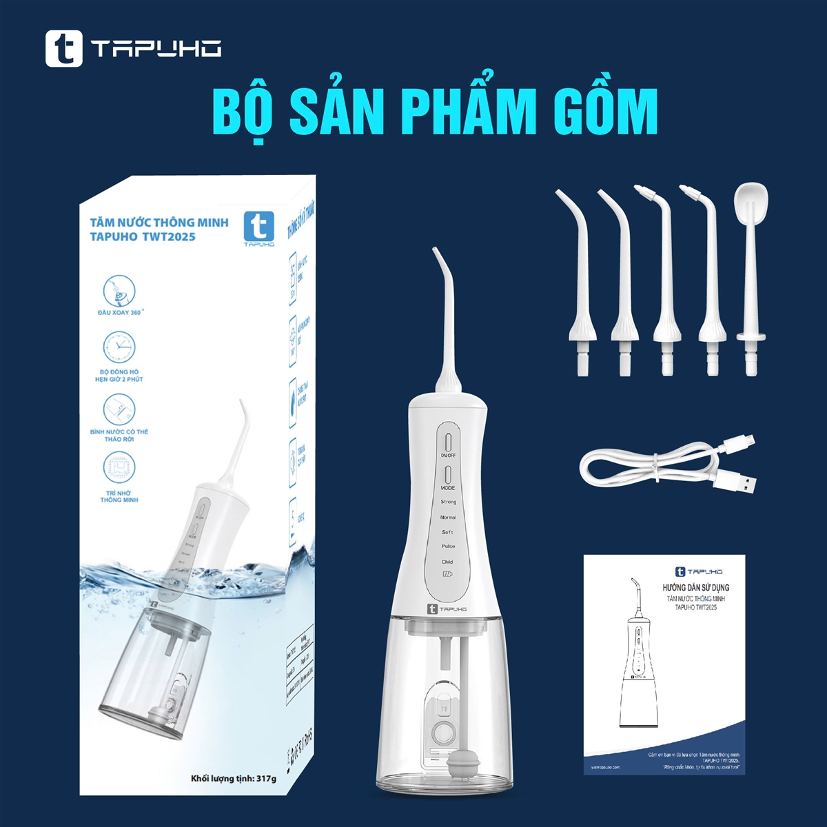 -Máy gồm 5 đầu tăm, bao gồm: 2 đầu tăm tiêu chuẩn, 1 đầu tăm vệ sinh lưỡi, 1 đầu tăm vệ sinh dành cho răng niềng, 1 đầu tăm dành cho răng bị viêm lợi, viêm nướu