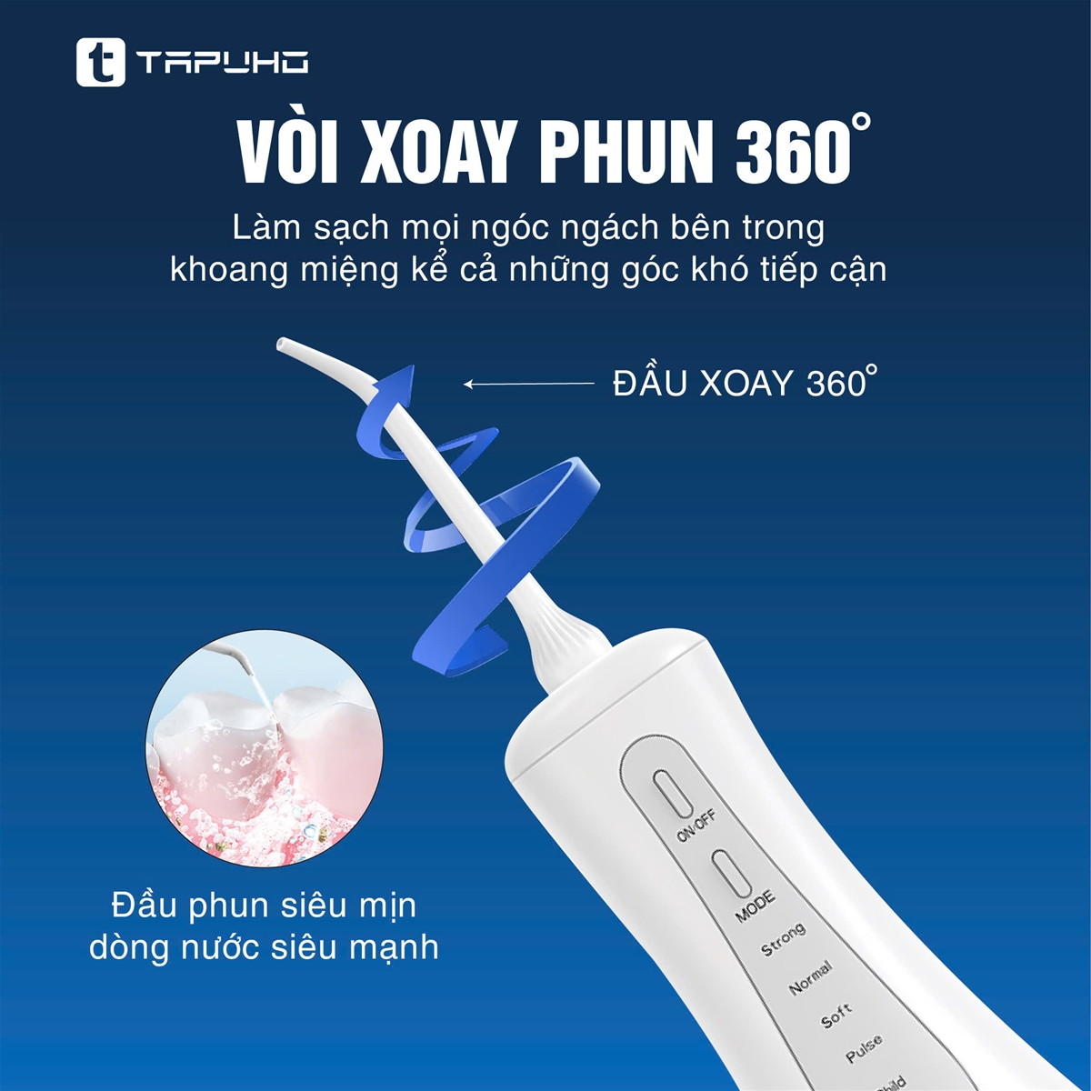 Cơ chế hoạt động đặc biệt: Tăm nước thông minh TAPUHO TWT2025 được thiết kế với cơ chế phun đứt đoạn theo từng nhịp. Các xung động nước tác động vào nướu và len lỏi qua từng kẽ răng, giúp làm sạch và mát-xa nướu hiệu quả mà không gây tổn thương cho nướu. Điều này đảm bảo răng miệng của bạn luôn được vệ sinh kỹ càng và khỏe mạnh. Đặc biệt, máy còn được thiết lập cơ chế khởi động tiếp sức 1 giây rất an toàn cho nướu: khi máy bắt đầu hoạt động, lực phun sẽ bắt đầu với lực phun thấp để nướu làm quen với lực nước phun, sau 1 giây tiếp sức lực nước sẽ trở lên bình thường.