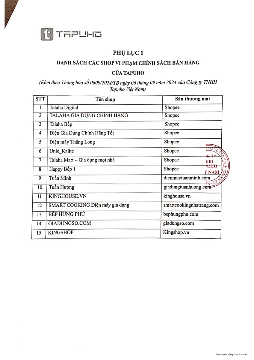 Chấm dứt bảo hành sản phẩm thương hiệu Tapuho đối với tất cả các shop vi phạm chính sách của TAPUHO